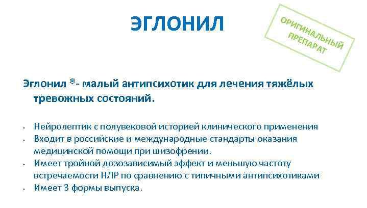 Сульпирид (действующее вещество эглонила) — это один из атипичных нейролептиков. Атипичные нейролептики, в отличие от типичных, действуют более мягко и меньше «бьют по мозгам». Основное назначение препарата — лечение тревоги, однако оно исключительно симптоматическое, то есть пока пьете — будет эффект, бросаете — препарат выводится из организма, и эффект пропадает.
