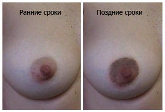 Неприятные ощущения сопровождаются уплотнением тканей, потемнением сосков. Грудь увеличивается в размерах. При пальпации можно обнаружить небольшие болезненные уплотнения — разросшиеся млечные дольки.