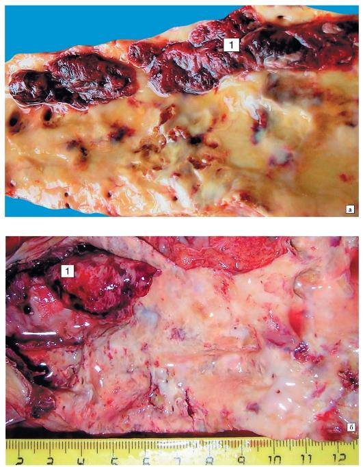 интима аорты с выраженными изменениями — с липидными (желтого цвета) пятнами, фиброзными (атеросклеротическими) бляшками, возвышающимися над поверхностью интимы, плотной консистенции, желтовато-белого цвета, видны осложненные поражения — множественные изъязвления атеросклеротических фиброзных бляшек, пристеночные тромбы (1), кальциноз (петрификация). Тромбы плотно или рыхло прикреплены к стенке аорты, головкой — в участке изъязвления атеросклеротической бляшки; поверхность тромбов тусклая, неровная, часто гофрированная, тромботические массы плотноватой консистенции, крошатся на разрезе.