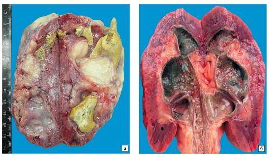 почка или увеличена (а) или уменьшена (б) в размерах, полости лоханки и чашечек резко расширены. В лоханке определяются плотные, овальной формы камни с гладкой или шероховатой поверхностью, серовато-белого цвета. Слизистая оболочка лоханки и чашечек утолщена. Корковое и мозговое вещество почки резко истончено, уплотнено, и почка на разрезе напоминает тонкостенный мешок, заполненный камнями и мочой
