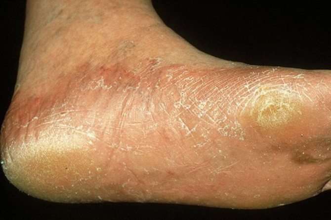 | Сквамозная | Желтизна кожных покровов, омозолелость. Стопы покрыты красными язвами и плоскими папулами. Присутствует болезненность, жжение и зуд. |